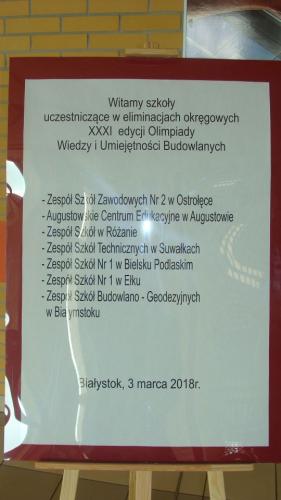Do rywalizacji olimpijskiej na szczeblu okręgowym z naszej szkoły zakwalifikowało się ośmioro uczniów z klasy drugiej, trzeciej i czwartej TB. Zawody odbywały się w Zespole Szkół Budowlano-Geodezyjnych im. Stefana Władysława Bryły w Białymstoku. Do współzawodnictwa stanęło 33 uczniów z siedmiu szkół okręgu białostockiego, tj. z Augustowa, Białegostoku, Bielska Podlaskiego, Ełku, Ostrołęki, Różana i Suwałk.
