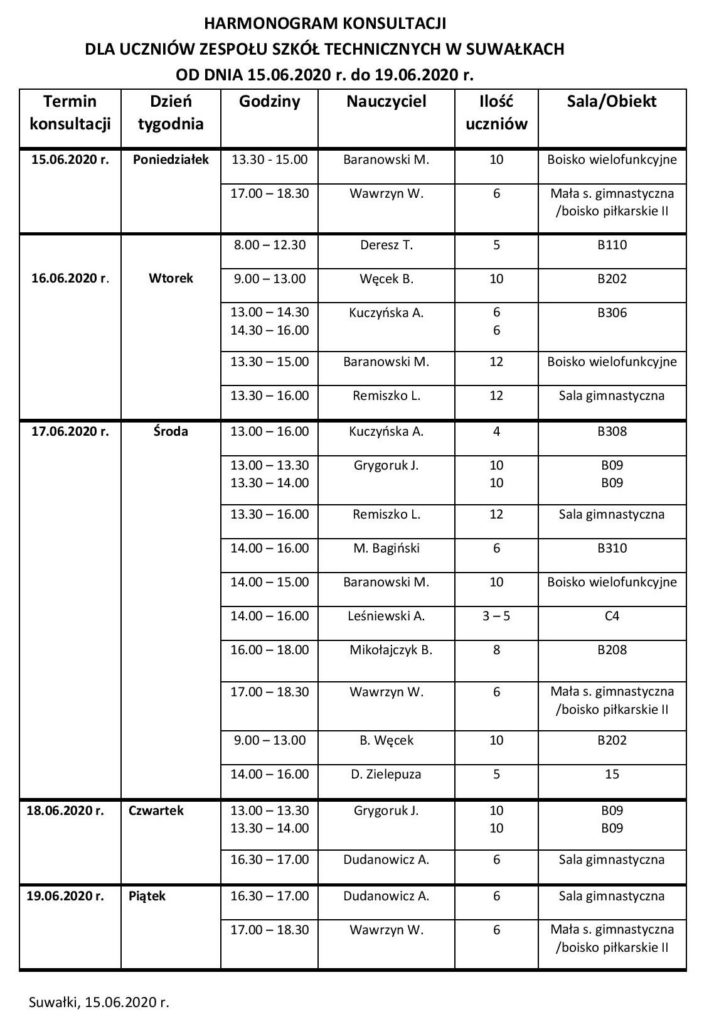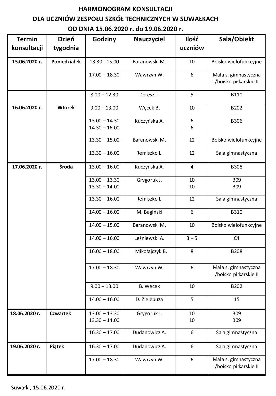 Harmonogram konsultacji dla uczniów 15.06 – 19.06.2020