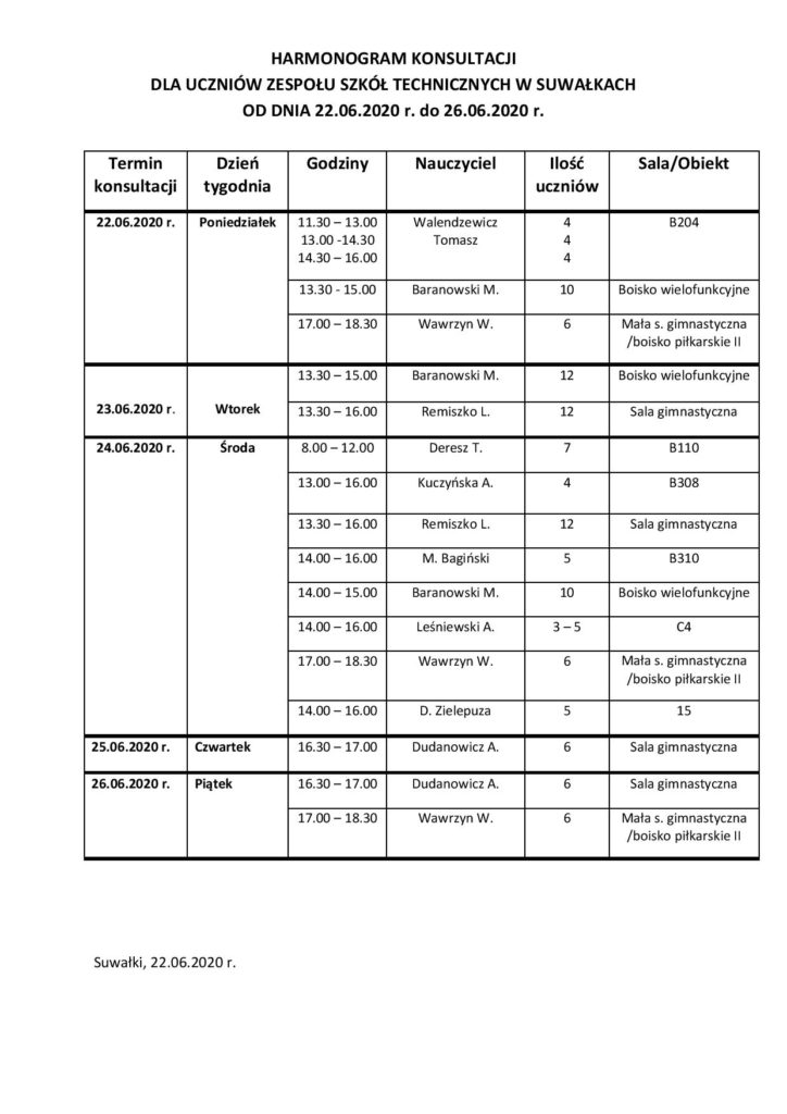 Harmonogram konsultacji dla uczniów 22.06 – 26.06.2020