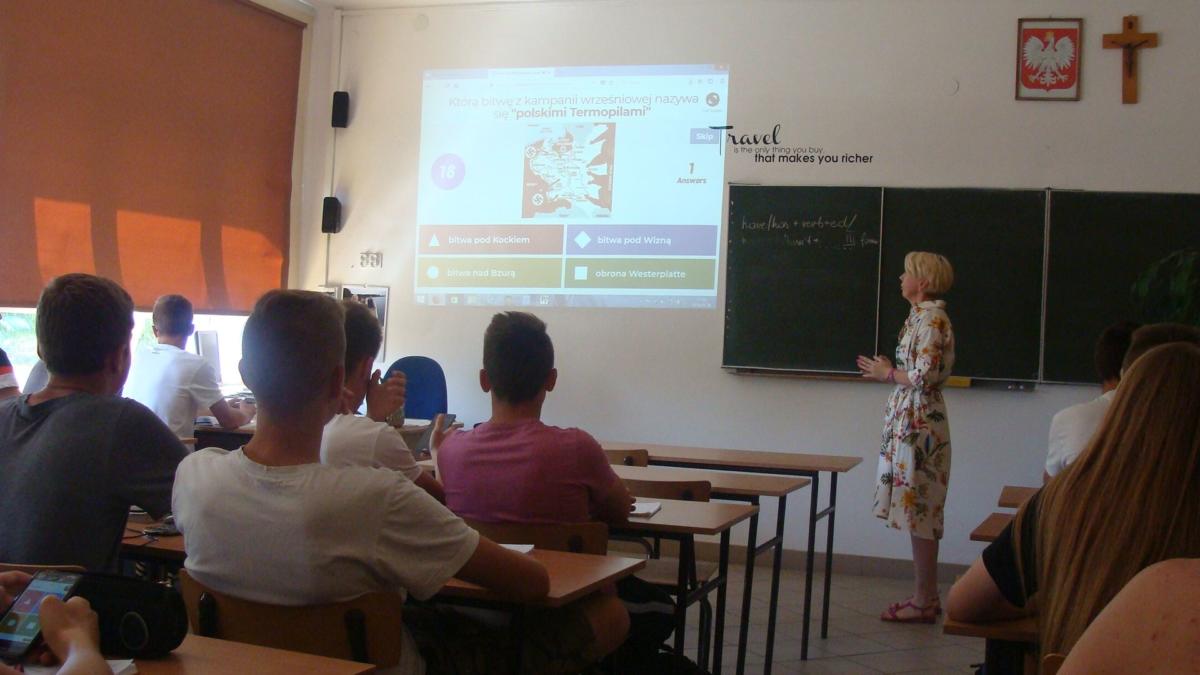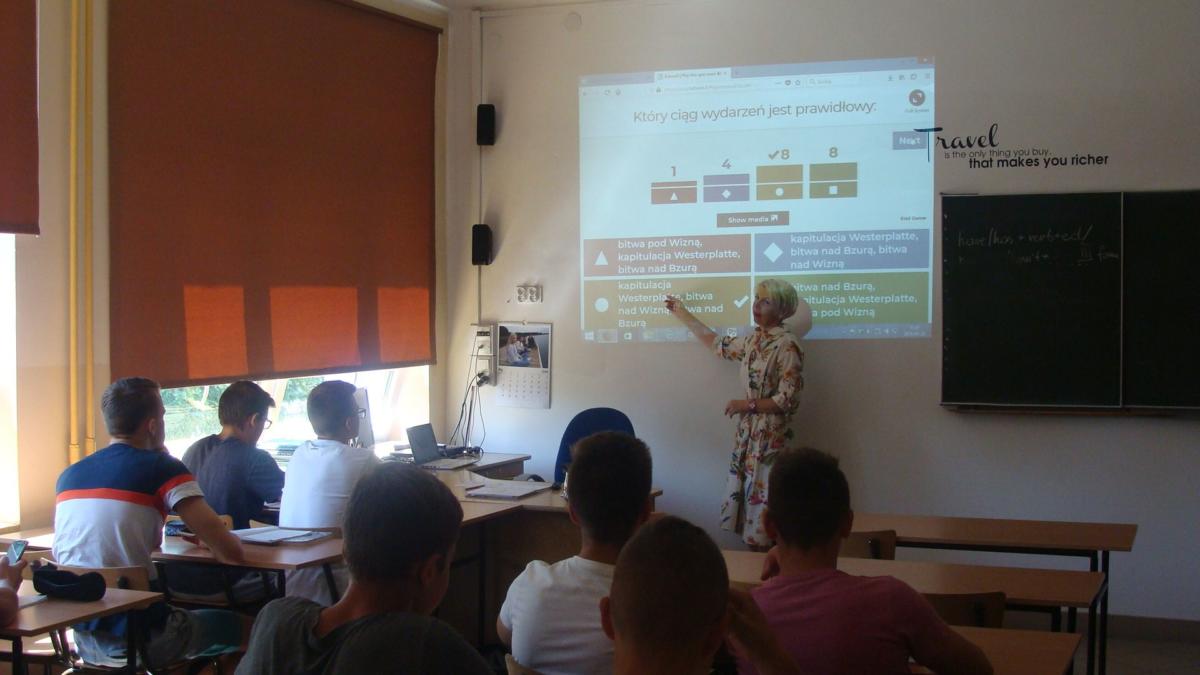Każdy uczeń potrafi świetnie posługiwać się smartfonem, tabletem czy laptopem. Wszyscy też lubią quizy, konkursy, teleturnieje i zdrową rywalizację w zespole. Umiejętności te zostały wykorzystane w poniedziałek, 28 maja 2018 roku, na lekcji otwartej z historii w klasie 1 TMO. Zajęcia prowadziła nauczycielka historii Marta Spudzis, a obserwowało ją grono pedagogiczne wraz z wicedyrektor Zofią Śliżewską.