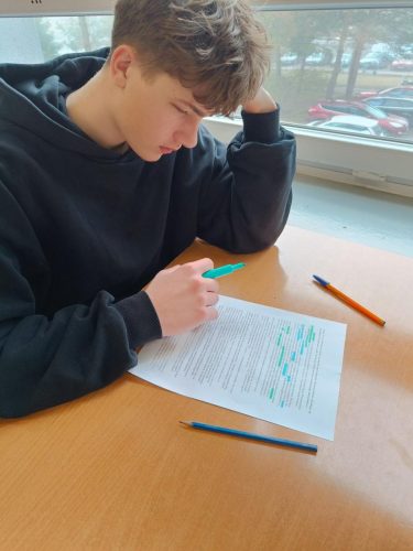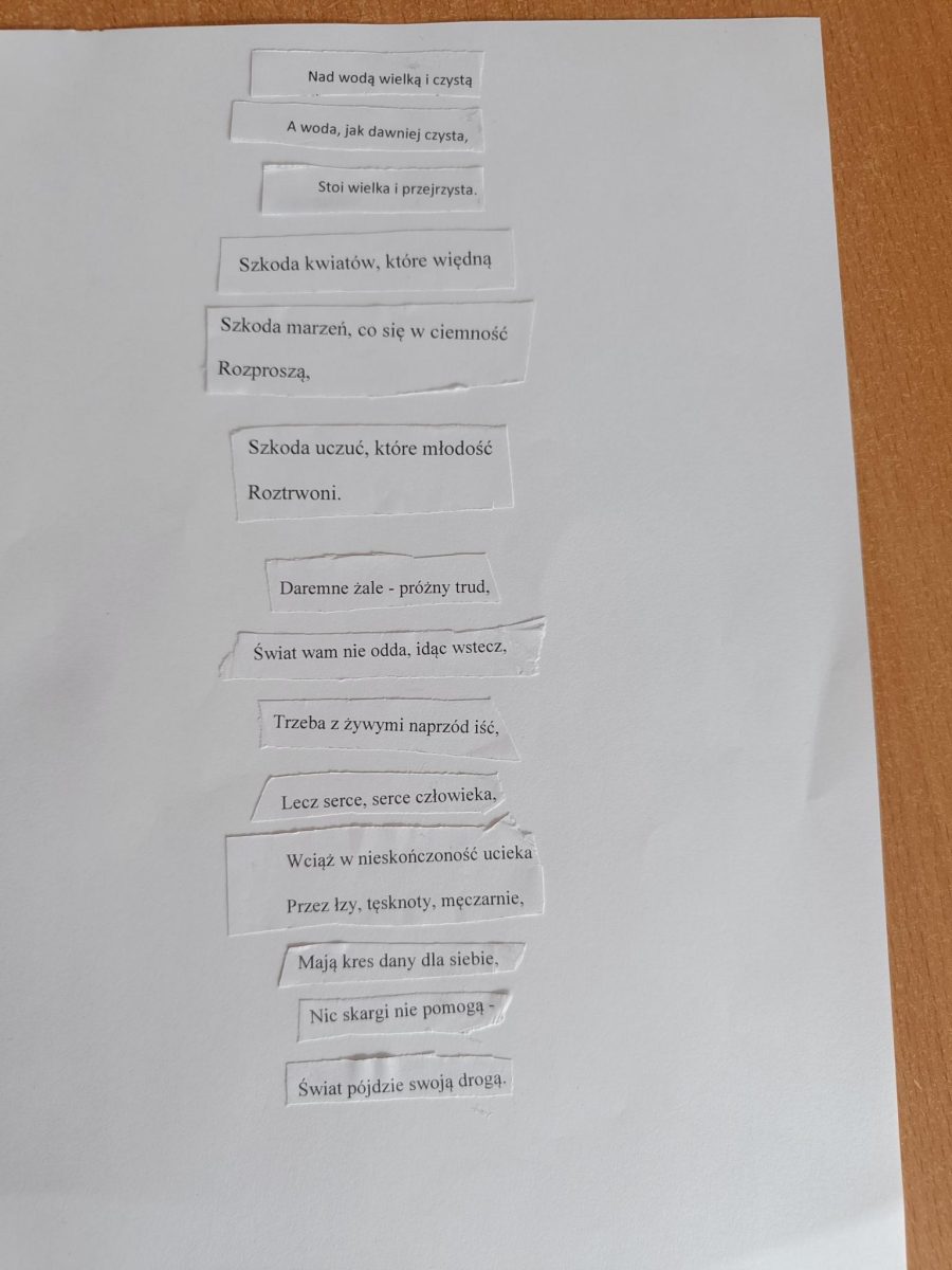 Nawet uczniowie o ścisłych umysłach mogą chcieć sprawdzić się w roli poetów. Obchodzony 21 marca Światowy Dzień Poezji stworzył właśnie taką okazję. Na lekcjach języka polskiego uczniowie z klas: 5TMR, 4TMR, 4TI, 3TMR, 1TR, 1TMR zostali nakłonieni do działań ujawniających ich artystyczne zdolności. Zadanie polegało na napisaniu wiersza. Wykorzystano do tego kilka metod. Jedną z nich była „Blackout Poetry” (Poezja z odzysku) – forma sztuki polegająca na tworzeniu nowego wiersza poprzez dekonstrukcję tekstu oryginalnego, czyli wymazywanie lub zamalowywanie fragmentów istniejącego tekstu. Zamiast pisać od zera, autor „wyławia” słowa z fragmentów lektur pisanych prozą lub fragmentów dramatów, a resztę zamazuje czarnym markerem, nadając całości zupełnie nowe, zaskakujące znaczenie. Ciekawą formą pracy okazał się też remiks poetycki – tworzenie nowych tekstów literackich poprzez przekształcanie, łączenie lub modyfikowanie istniejących już dzieł. Wywodzi się z szeroko rozumianej kultury remiksu, która zakłada, że nic nie powstaje z próżni, a twórczość polega na nadawaniu nowych znaczeń temu, co już znamy. Zadanie nie należało do najprostszych. Wymagało uruchomienia wyobraźni, głębokiej analizy tekstu, wymyślenia tematu, wokół którego zostanie stworzona poetycka opowieść. Wszyscy uczniowie stanęli na wysokości zadania. Ich wiersze okazały się bardzo dobre. Niektórzy odkryli w sobie prawdziwy talent. Kto wie, może to początek ich artystycznej drogi? Poniżej zaledwie klika uczniowskich wierszy.