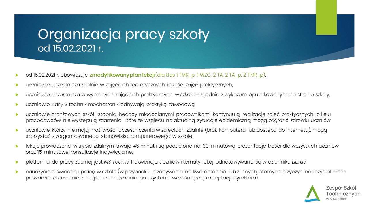 Dni zajęć poszczególnych klas w pracowniach i na warsztatach szkolnych – obowiązuje od 15.02.2021 r.: