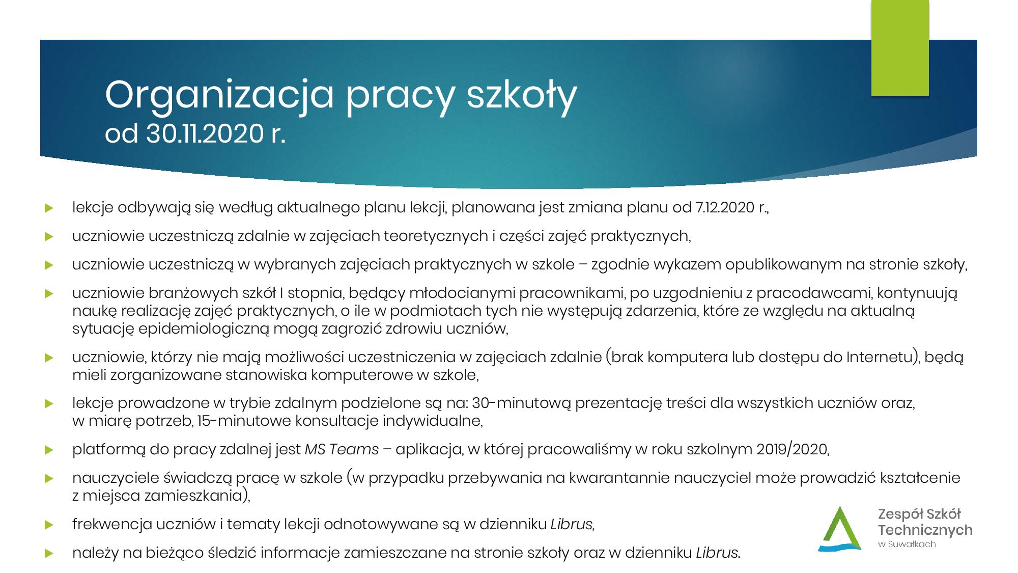 Harmonogram pracy szkoły (poszczególnych klas) od 30 listopada 2020 r.: