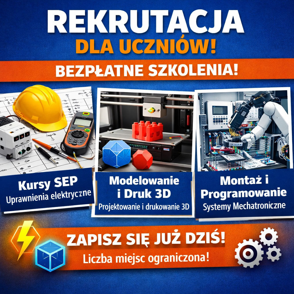Rozpoczynamy rekrutację na bezpłatne kursy specjalistyczne w ramach projektu „Suwalskie Centra Kształcenia Zawodowego. Poprawa jakości systemu kształcenia na terenie Miasta Suwałki poprzez modernizację kształcenia w Zespole Szkół nr 4, Zespole Szkół nr 6 i w Zespole Szkół Technicznych w Suwałkach” współfinansowanego ze środków Europejskiego Funduszu Społecznego Plus w ramach programu Fundusze Europejskie dla Podlaskiego 2021-2027 Priorytetu VIII Fundusze na rzecz edukacji i włączenia społecznego Działania 8.2 Zintegrowany terytorialnie rozwój edukacji i kształcenia.