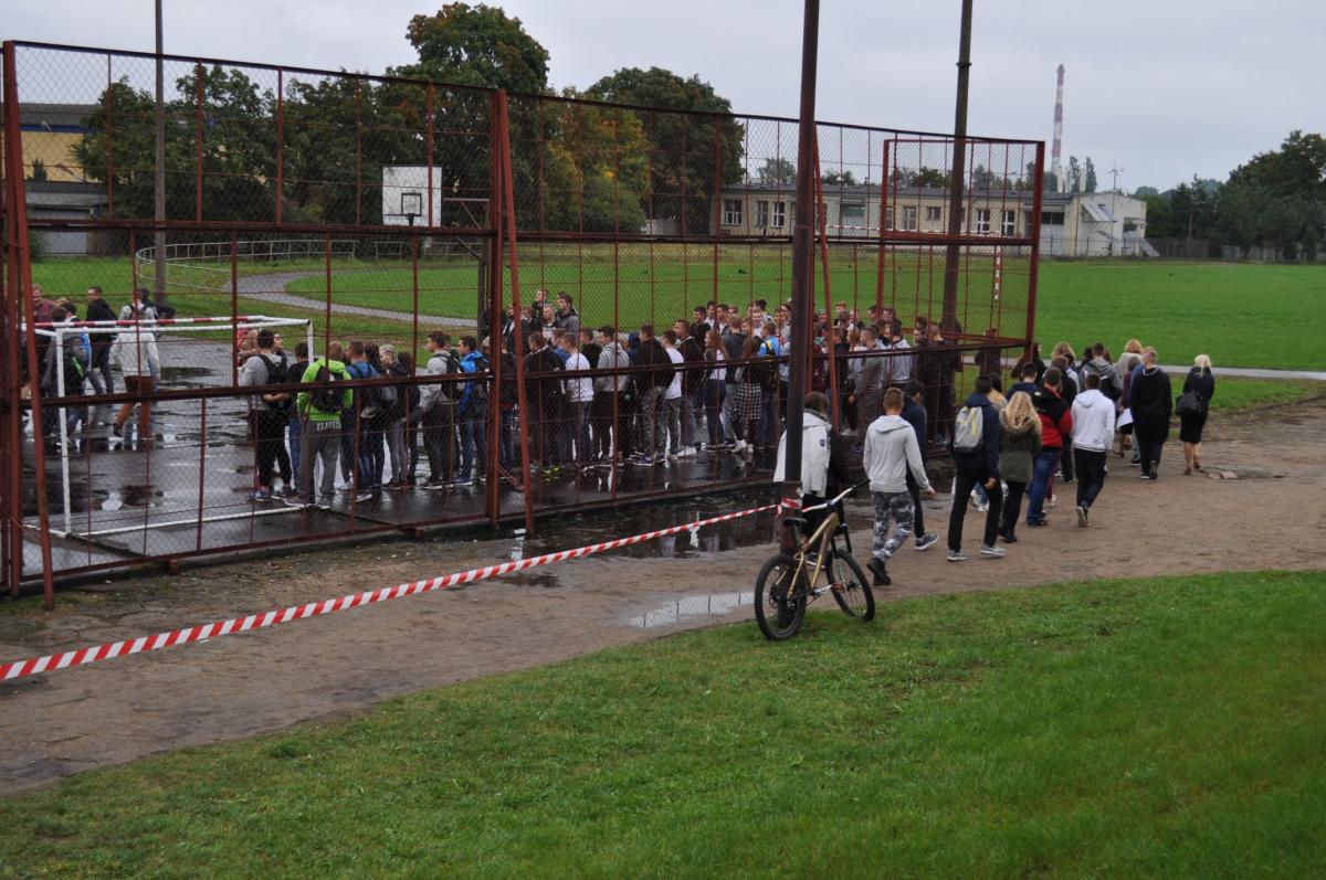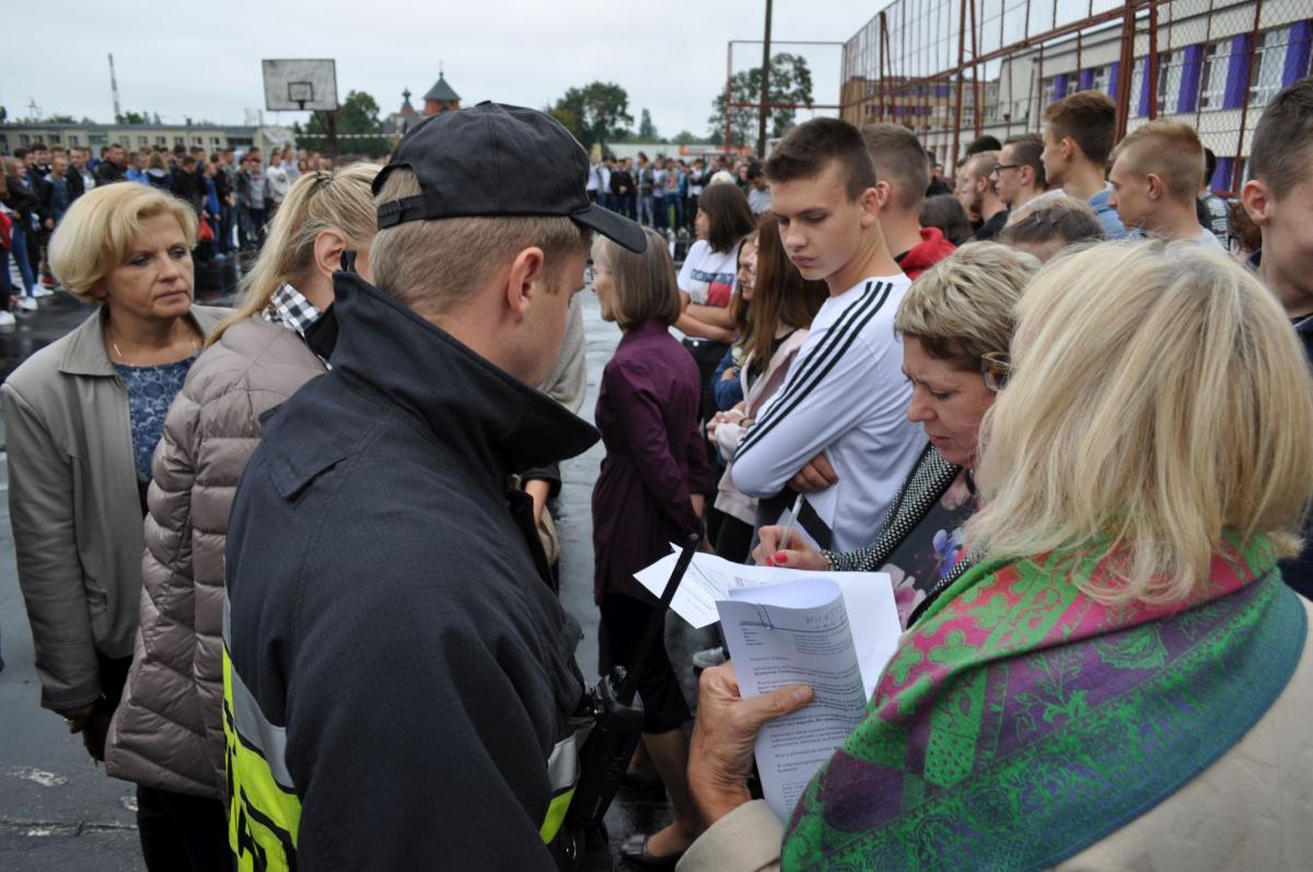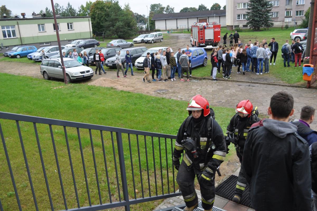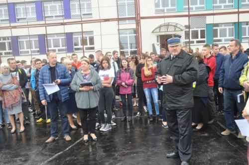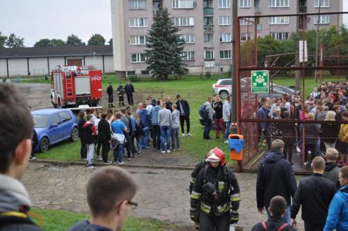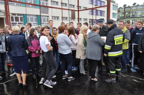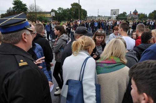 Pod bacznym okiem zastępcy komendanta miejskiego PSP, mł. brygadiera Pana Arkadiusza Buchowskiego, dowódca jednostki ratowniczo-gaśniczej odebrał meldunek o liczbie osób ewakuowanych od dyrektor naszej szkoły Anny Musiałowicz.