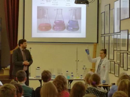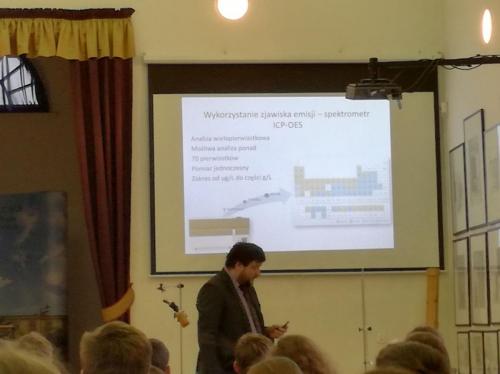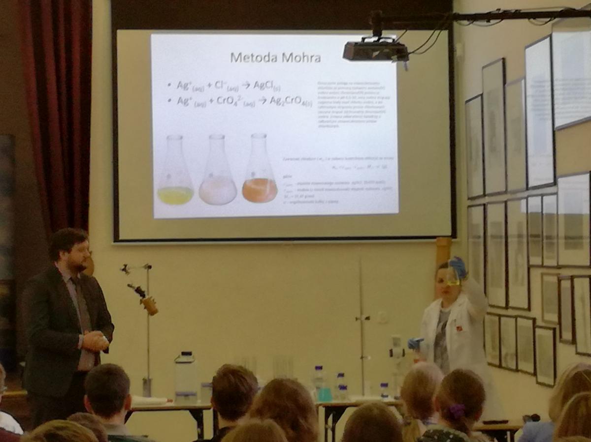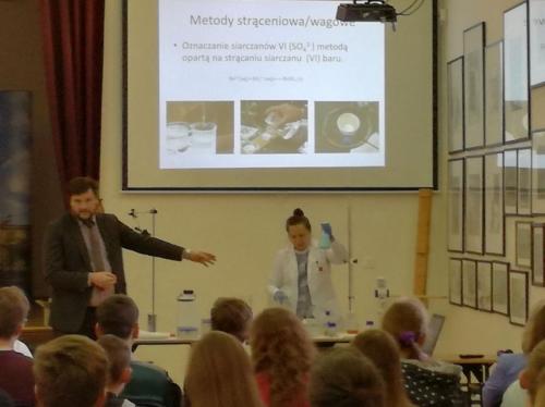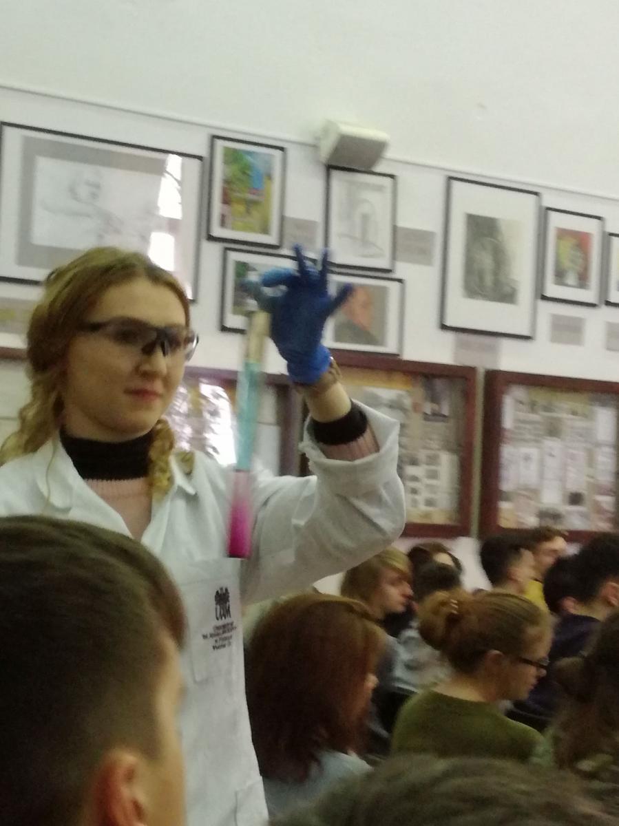 Podczas spotkania młodzież wysłuchała najpierw wykładów: prof. Renaty Jastrząb (Dlaczego warto interesować się chemią?) i prof. Macieja Kubickiego (Do czego potrzebna jest analityka?) z Wydziału Chemii Uniwersytetu im. A. Mickiewicza w Poznaniu, a następnie obserwowała pokaz doświadczeń chemicznych.