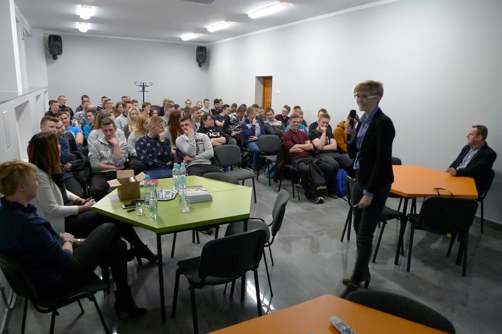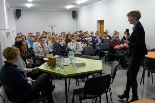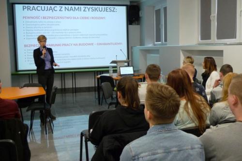 Podczas spotkania uczniowie kształcący się w zawodzie technik budownictwa obejrzeli prezentację linii produkcyjnej wyrobów (tj. prefabrykowanych domów o konstrukcji drewnianej) oraz przykładowe montaże, a także dowiedzieli się o możliwościach zatrudnienia nie tylko na linii produkcyjnej, ale też w administracji przedsiębiorstwa.