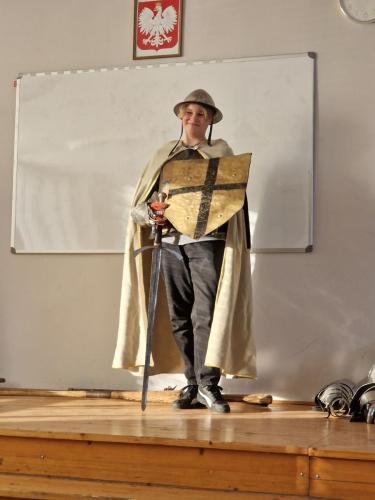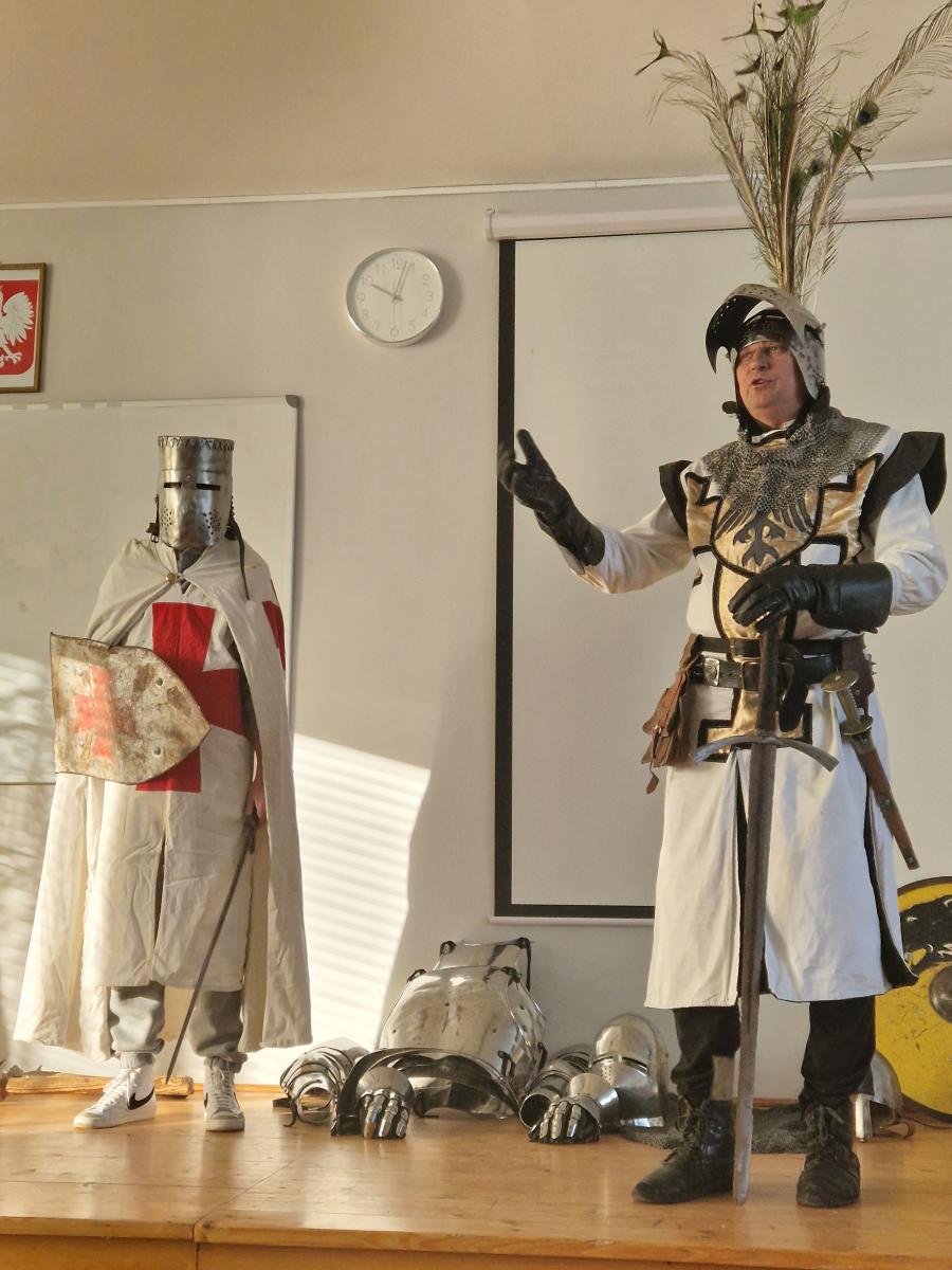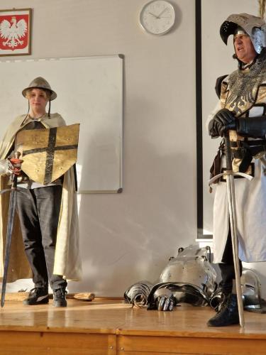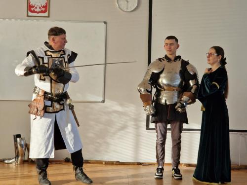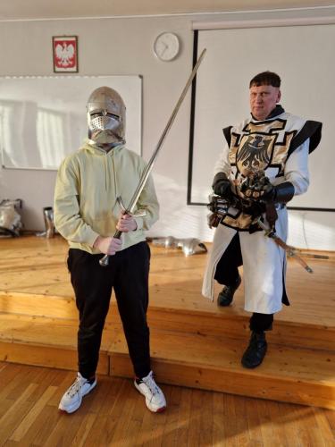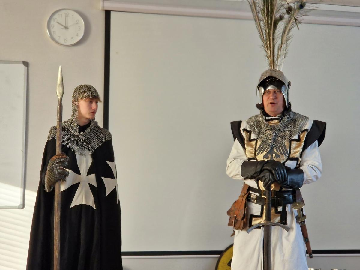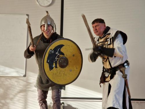 Tym razem, w trakcie pokazu młodzież miała okazję, dobrze się bawiąc, zdobyć wiedzę historyczną na temat wypraw krzyżowych. Podczas barwnego i niezwykle sugestywnego opowiadania przygotowanego przez pana Jacentego Ordowskiego uczniowie mogli również sprawdzić swoją zwinność, refleks i przymierzyć stroje z epoki.